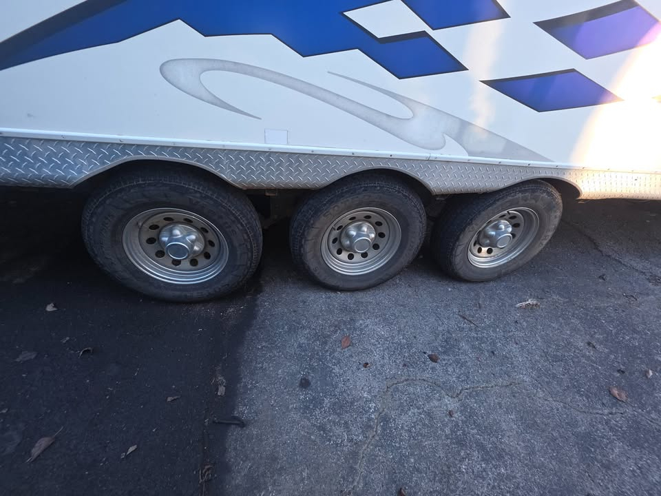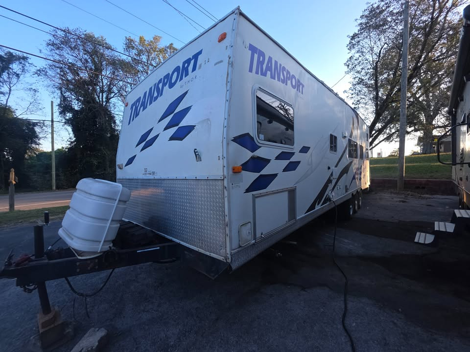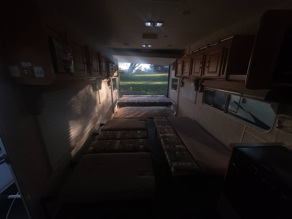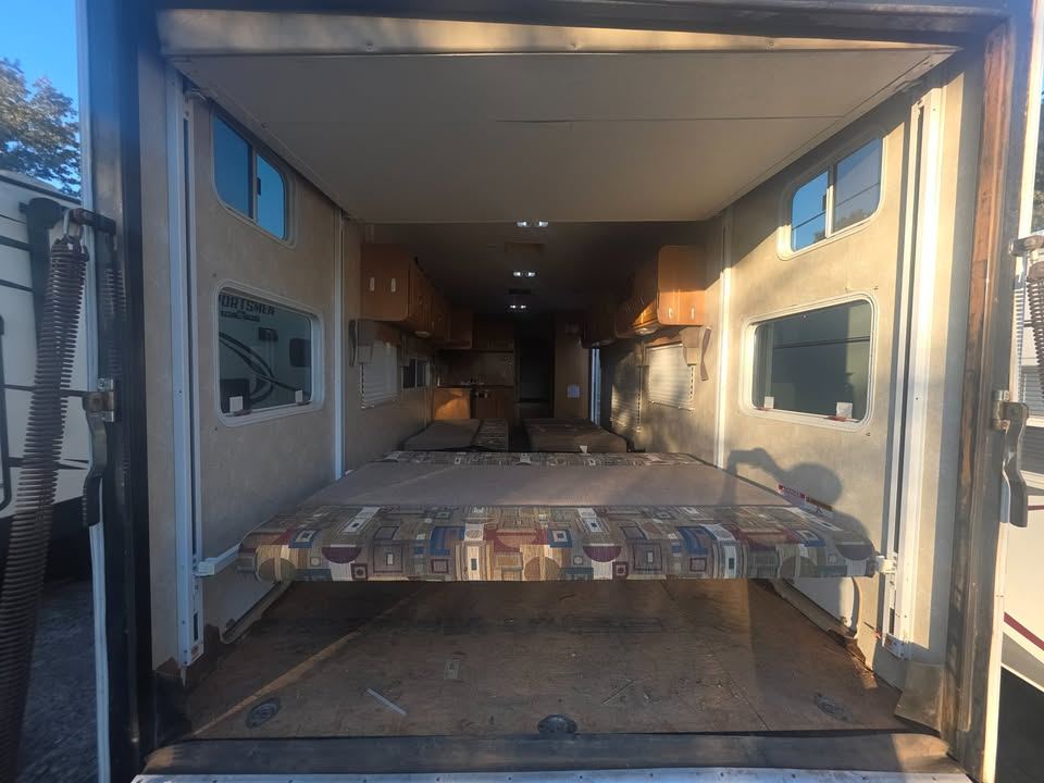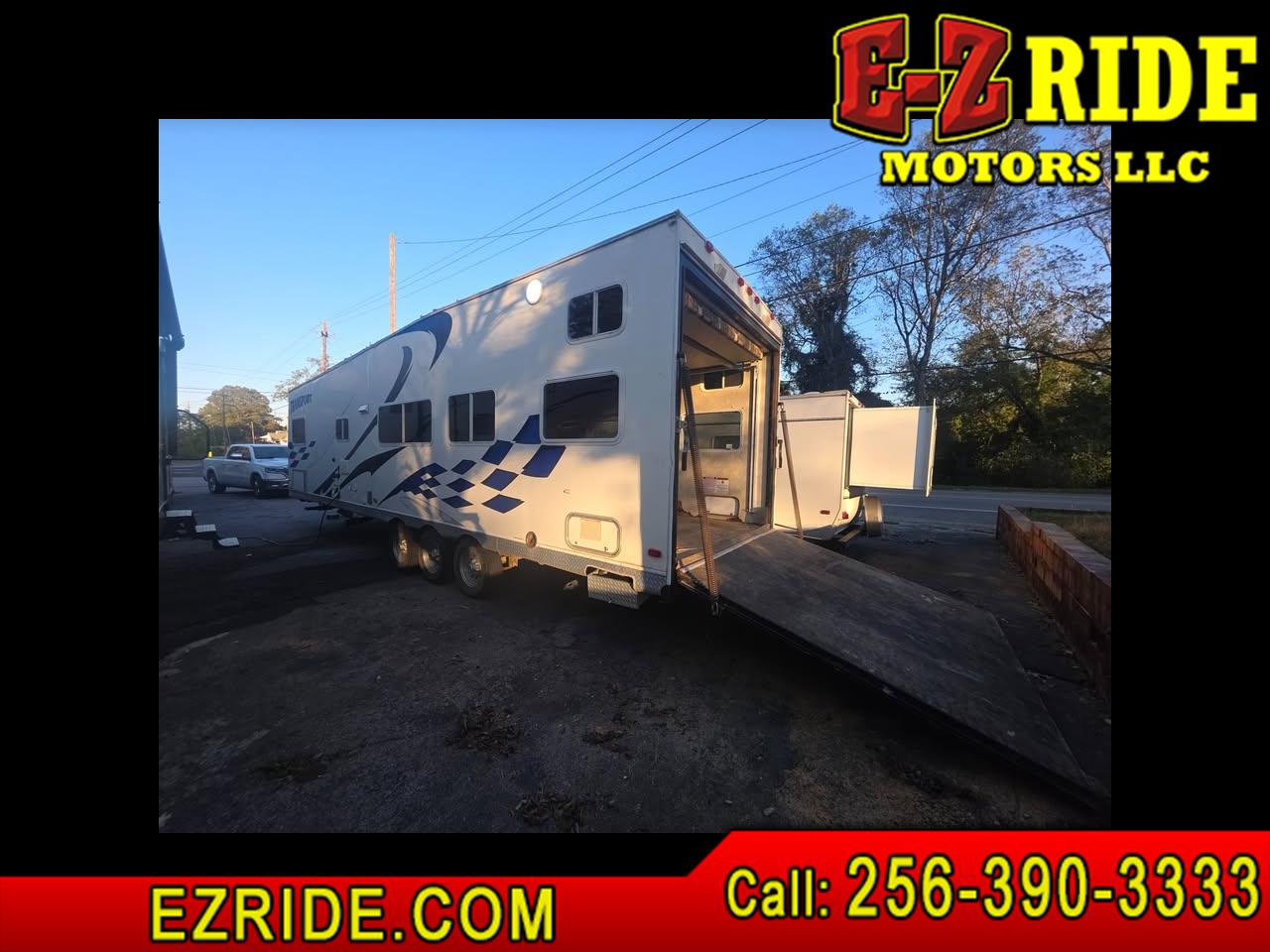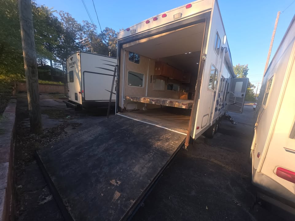 Salvage Title. Awning is torn. No Trades This Toy Hauler has alot of Space in it. Thi Axle. 1 Bedroom in front Bathroom Kitchen Electric Beds in the back The thermostat is a bit funny but figured out how to turn units on. Ice Cold AC Furnace very hot and blows very fast and blows hard. Toy Hauler is 16 feet long to the stove 19.2 fee long the to fire extinguisher 8.2 Feet Wide Wood Grain appears to be in good shape and cabinets, some minor imperfections inside but mostly normal wear and tear.