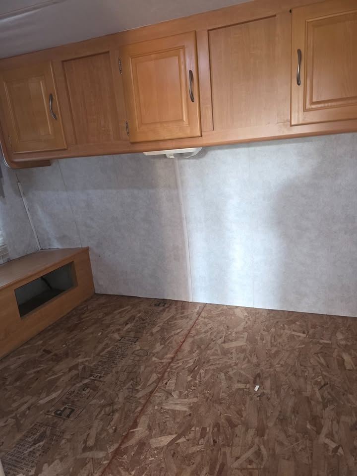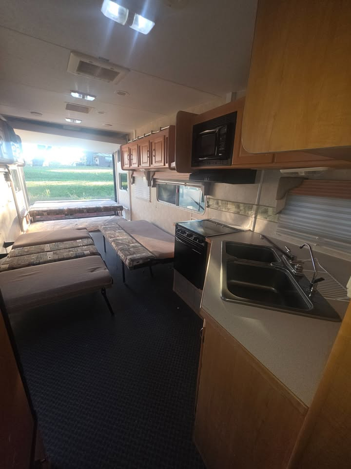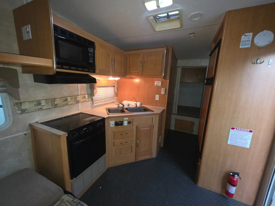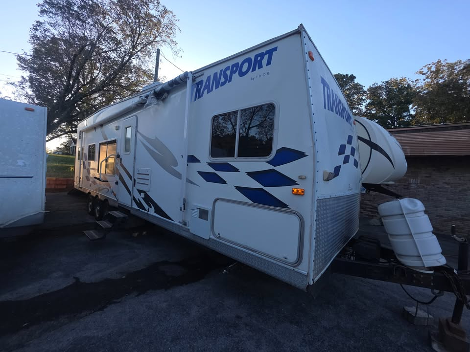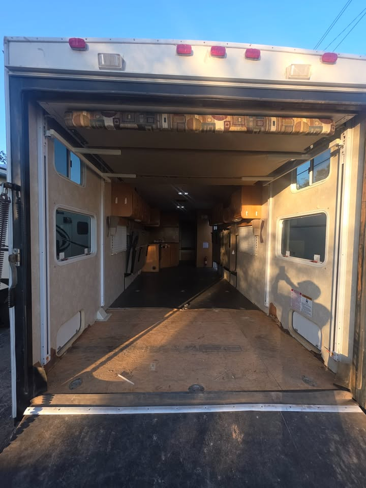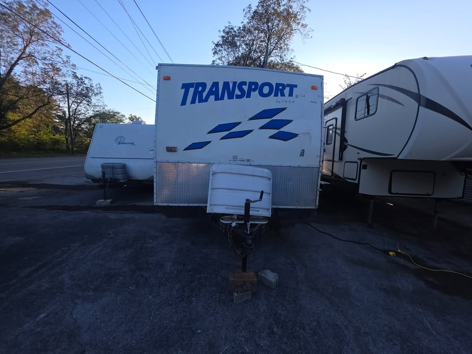 Salvage Title. Awning is torn. No Trades This Toy Hauler has alot of Space in it. Thi Axle. 1 Bedroom in front Bathroom Kitchen Electric Beds in the back The thermostat is a bit funny but figured out how to turn units on. Ice Cold AC Furnace very hot and blows very fast and blows hard. Toy Hauler is 16 feet long to the stove 19.2 fee long the to fire extinguisher 8.2 Feet Wide Wood Grain appears to be in good shape and cabinets, some minor imperfections inside but mostly normal wear and tear.