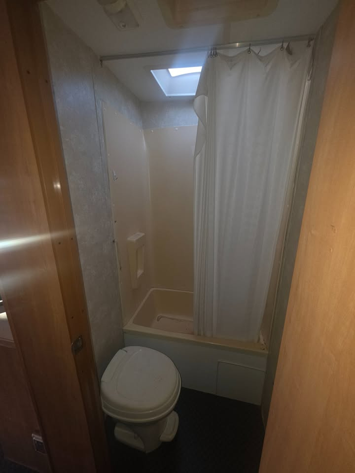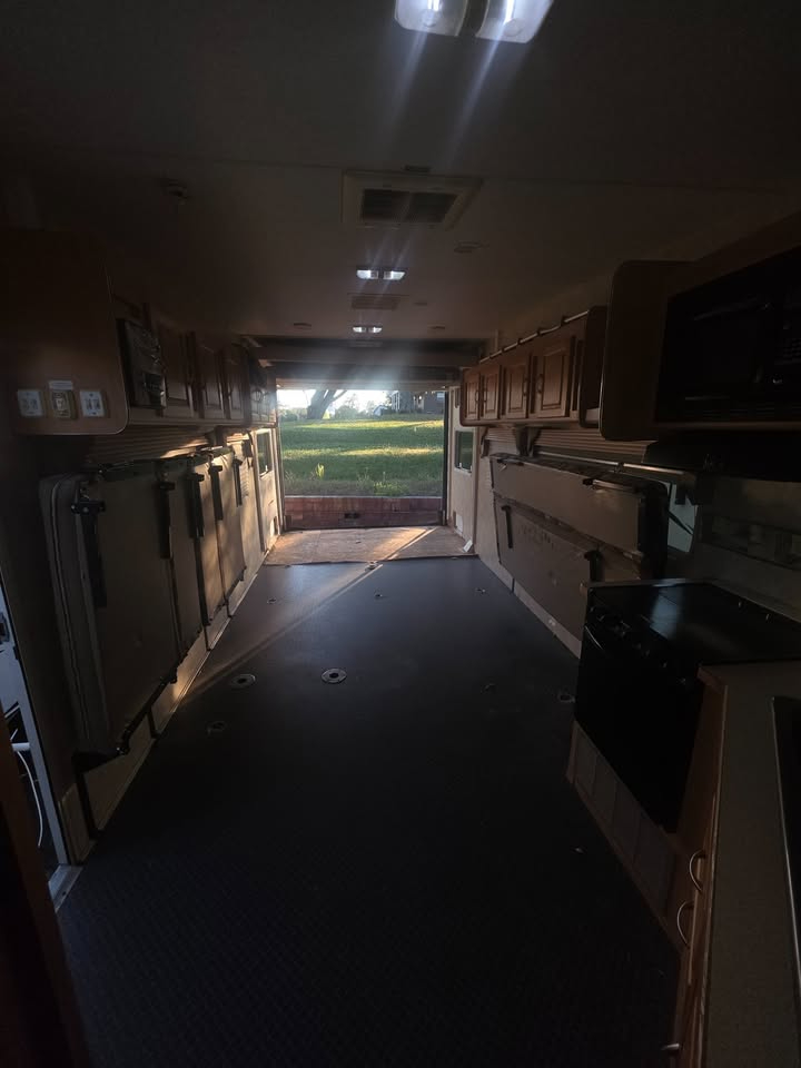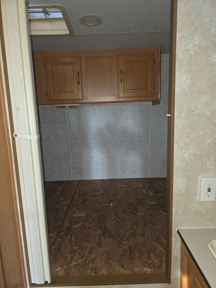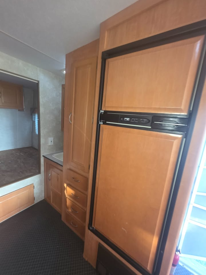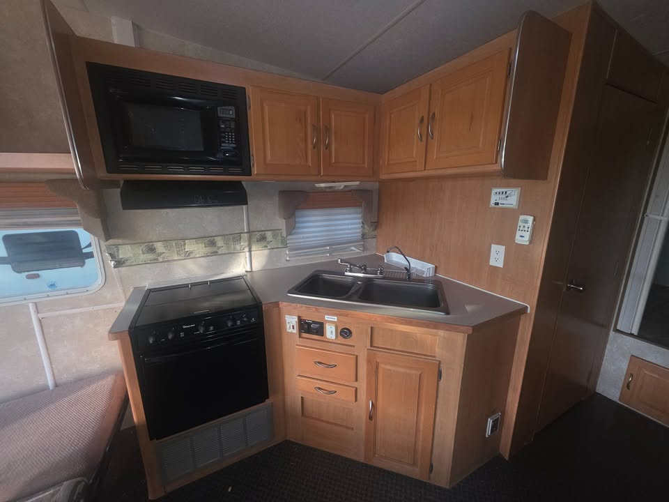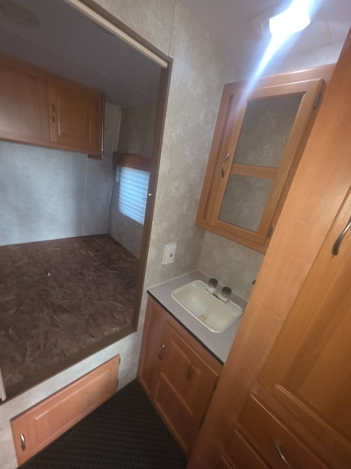 Salvage Title. Awning is torn. No Trades This Toy Hauler has alot of Space in it. Thi Axle. 1 Bedroom in front Bathroom Kitchen Electric Beds in the back The thermostat is a bit funny but figured out how to turn units on. Ice Cold AC Furnace very hot and blows very fast and blows hard. Toy Hauler is 16 feet long to the stove 19.2 fee long the to fire extinguisher 8.2 Feet Wide Wood Grain appears to be in good shape and cabinets, some minor imperfections inside but mostly normal wear and tear.