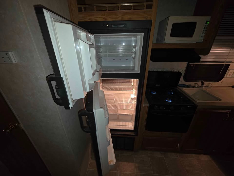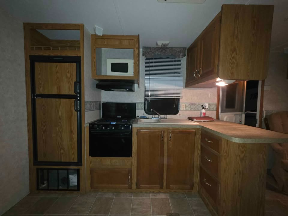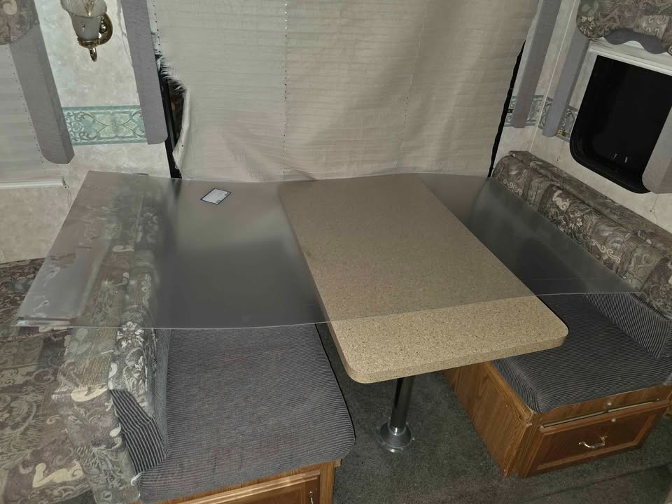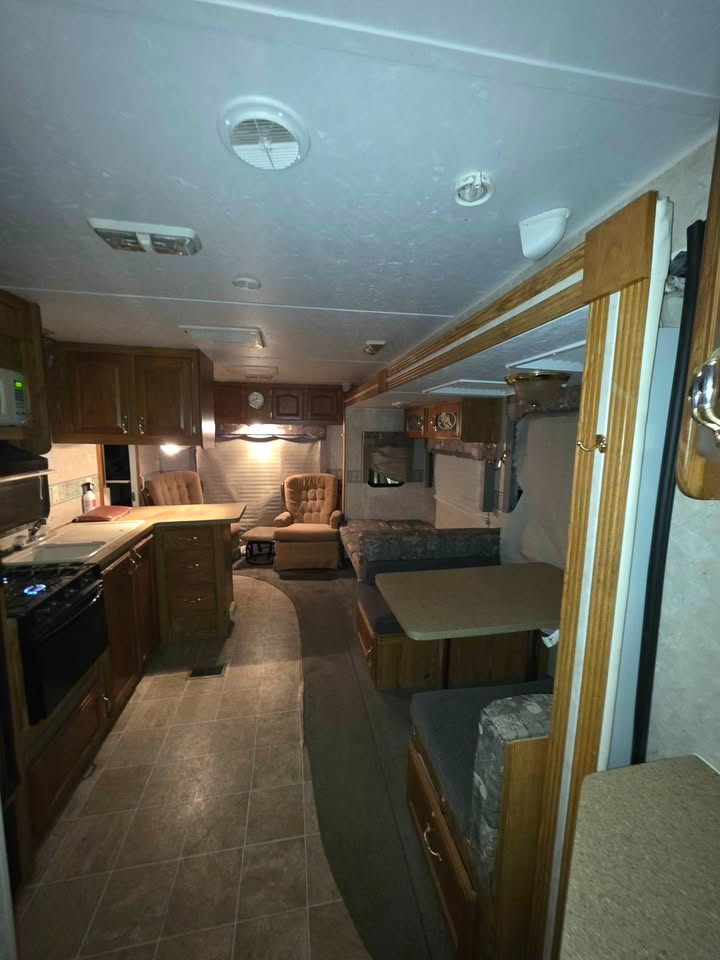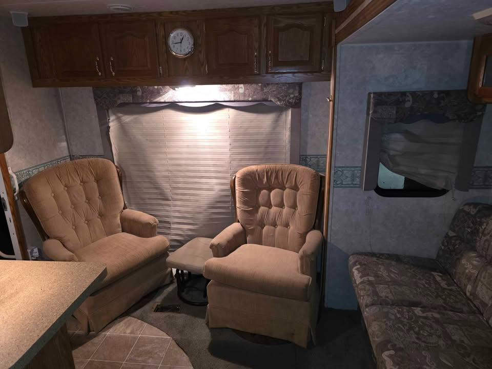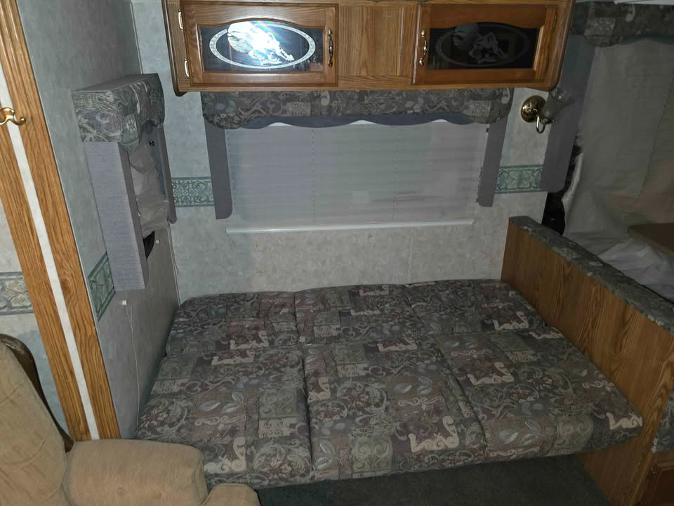 2 of the window glass broken so one has plexiglass but not perfect the other is uncut glass piece would need cut in. Other option would be to replace the glass 5ft by 3ft. Furnace tries to ignite but not firing. AC Blows ice cold Stove works Refrigerator works Slide works Radio Ceiling fan In bedroom Roof looks good and not seeing any leaks although some minor water has gotten in where window behind the chairs but most solid. New Tires If you looking for a cheap place to live this would be perfect Have a video inside if want to see it let me know. Clear Title