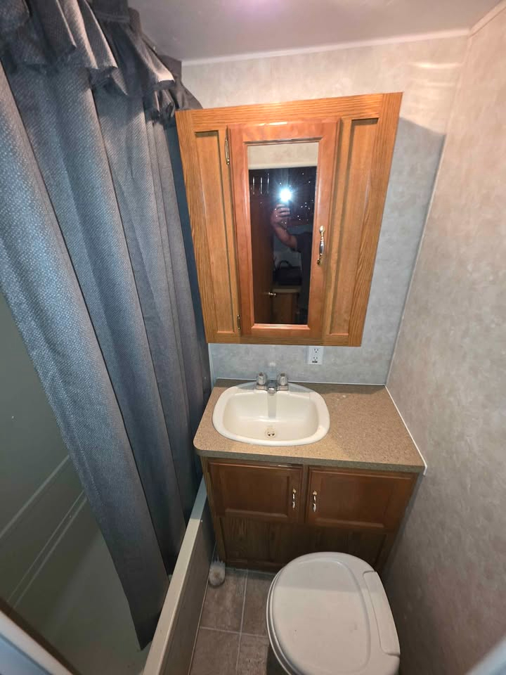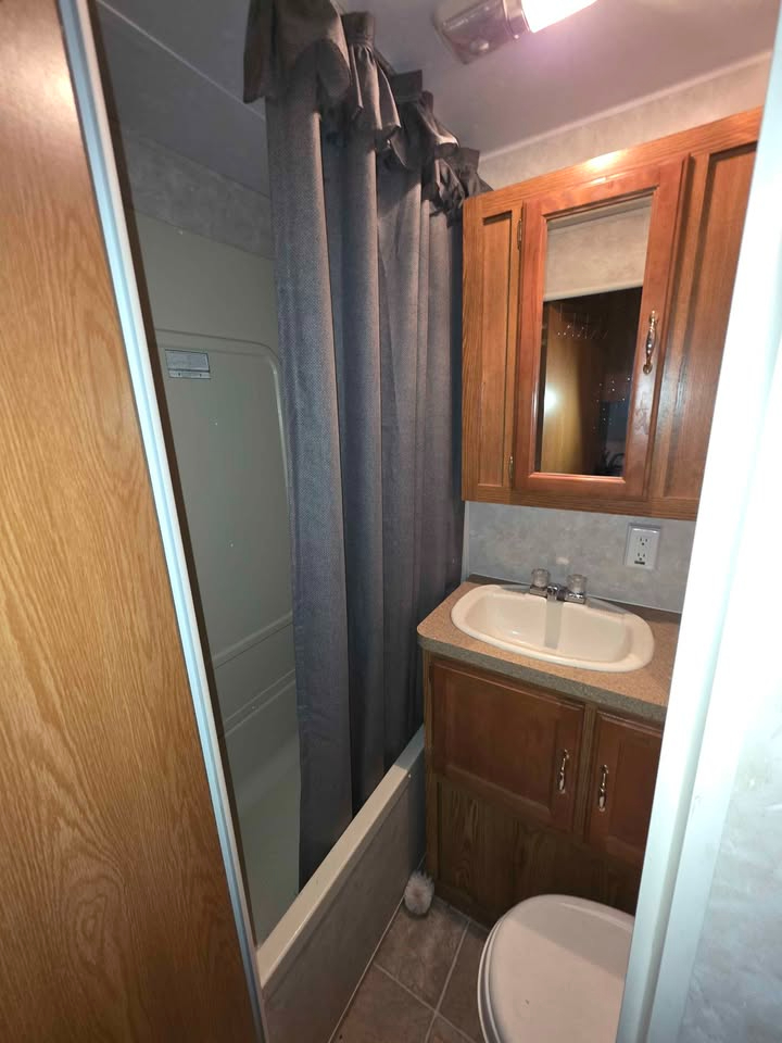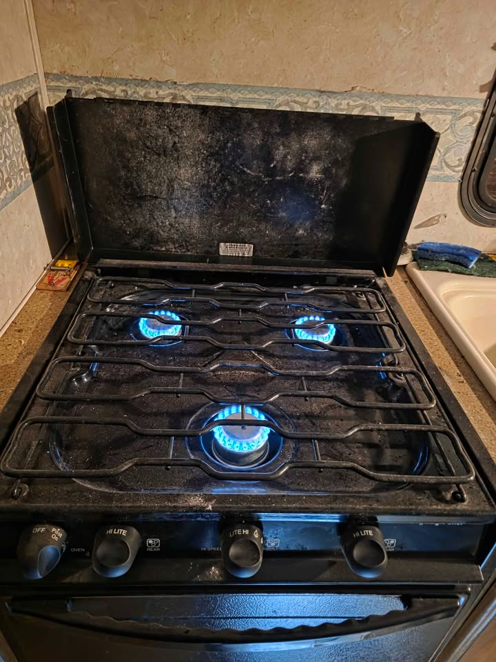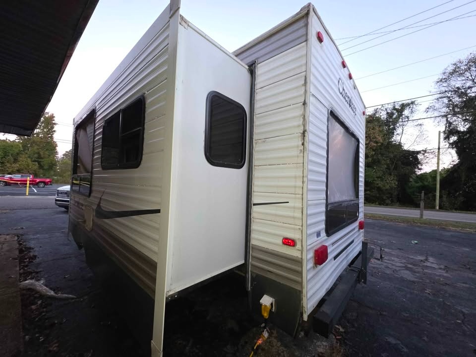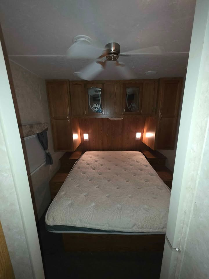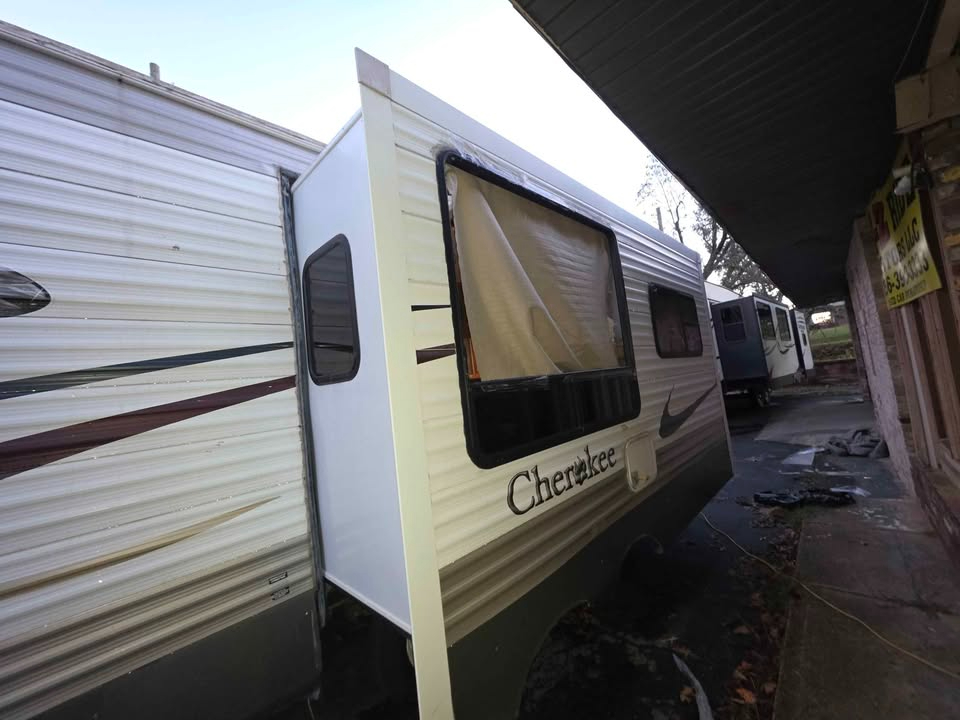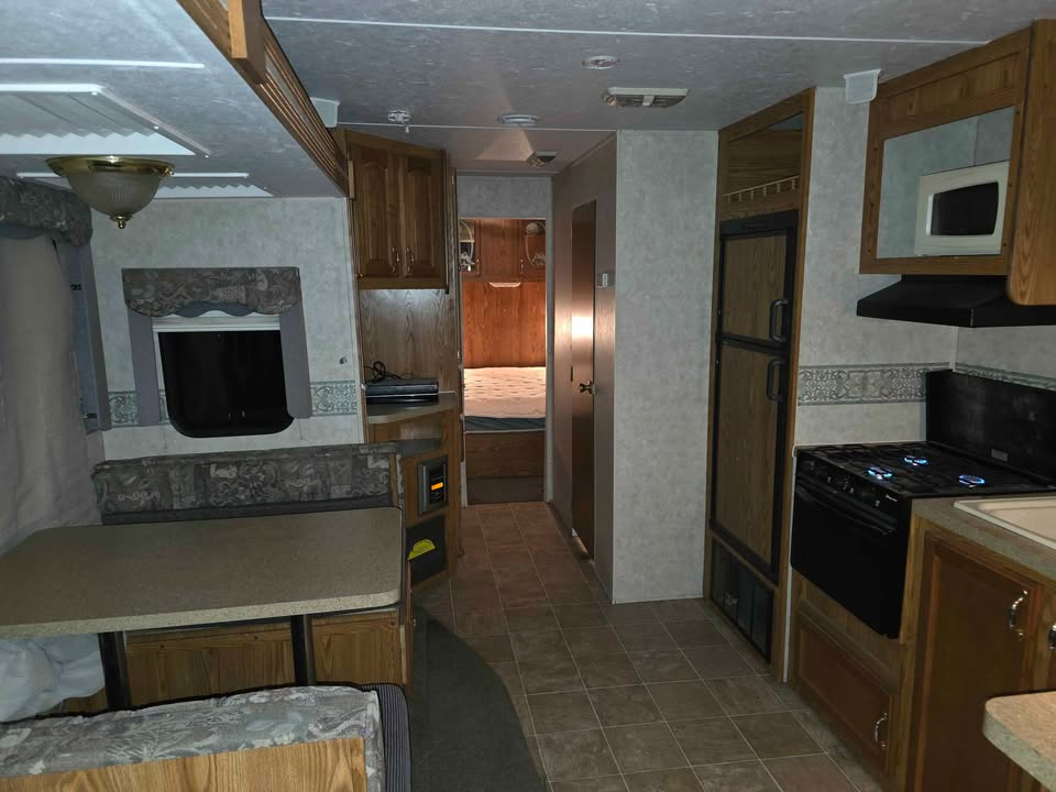 2 of the window glass broken so one has plexiglass but not perfect the other is uncut glass piece would need cut in. Other option would be to replace the glass 5ft by 3ft. Furnace tries to ignite but not firing. AC Blows ice cold Stove works Refrigerator works Slide works Radio Ceiling fan In bedroom Roof looks good and not seeing any leaks although some minor water has gotten in where window behind the chairs but most solid. New Tires If you looking for a cheap place to live this would be perfect Have a video inside if want to see it let me know. Clear Title